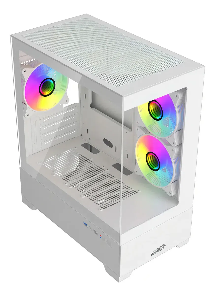 El Sentey H30 White ofrece un diseño moderno con panel frontal y lateral de vidrio templado, acompañado por cinco ventiladores ARGB que aportan estética y refrigeración. Su formato Mid Tower permite montar motherboards ATX y componentes de alto rendimiento, manteniendo un flujo de aire estable y un interior ordenado para configuraciones de escritorio actuales.