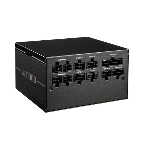Fuente de alimentación Cooler Master Elite Gold de 1000 W, diseñada para equipos de alto rendimiento que requieren máxima estabilidad y eficiencia energética. Su diseño full modular permite una mejor organización del cableado, optimizando el flujo de aire y facilitando el armado en configuraciones exigentes como PCs gamer avanzadas y estaciones de trabajo.
